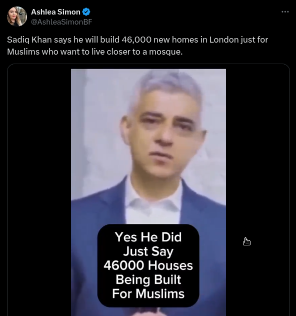 A video of Mr Khan speaking has been shared with the caption: “Sadiq Khan says he will build 46,000 new homes in London just for Muslims who want...
