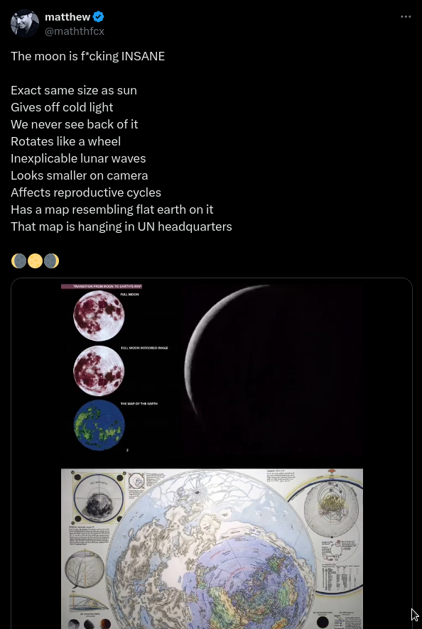 A post made on X claims the Moon is the same size as the Sun and affects reproductive cycles. The caption reads, “The moon is f*cking INSANE Exact...