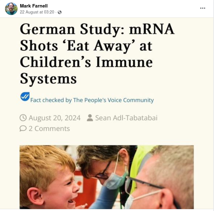 The screenshot of an article titled "German Study: mRNA Shots 'Eat Away' at Children's Immune Systems," published in The People's Voice, a website...