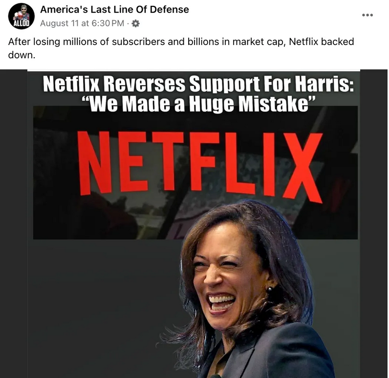 No, Netflix Did Not 'Reverse Support' for Harris, Saying 'We Made a Huge Mistake'