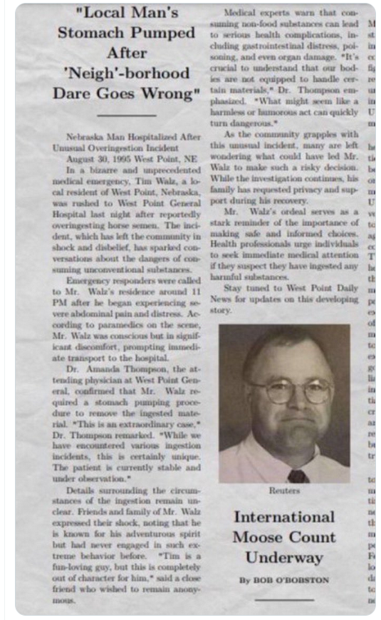 In August 2024, a rumor that Minnesota Gov. Tim Walz had to get his stomach pumped after ingesting horse semen on a dare circulated the internet...