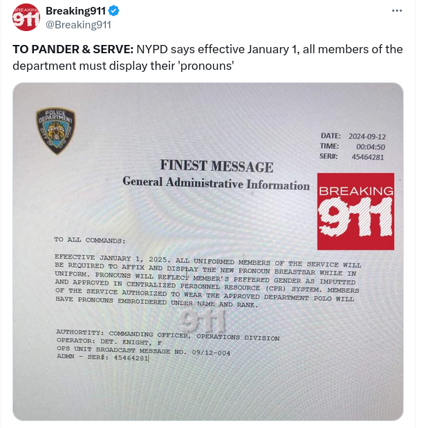 Is a New York Police Department memo that says all uniformed members must start displaying their pronouns starting January 1, 2025, authentic? No,...