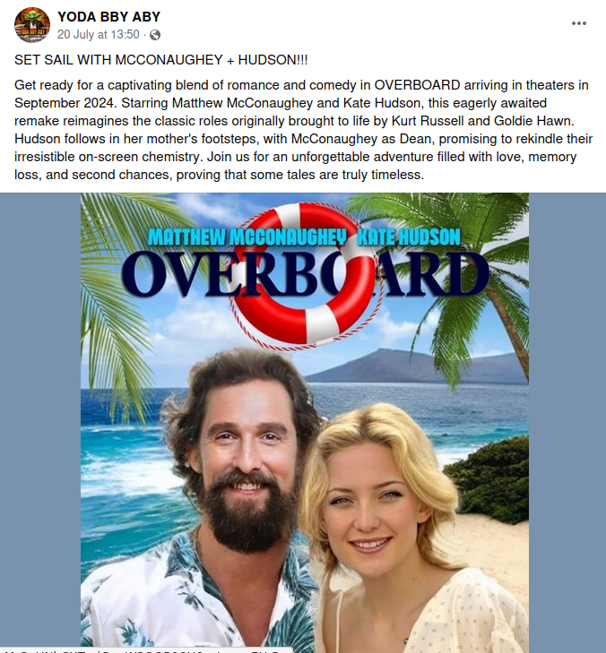 On July 20, 2024, a Facebook post (archived) from the page YODA BBY ABY claimed that a remake of the 1987 comedy film "Overboard" would be released...