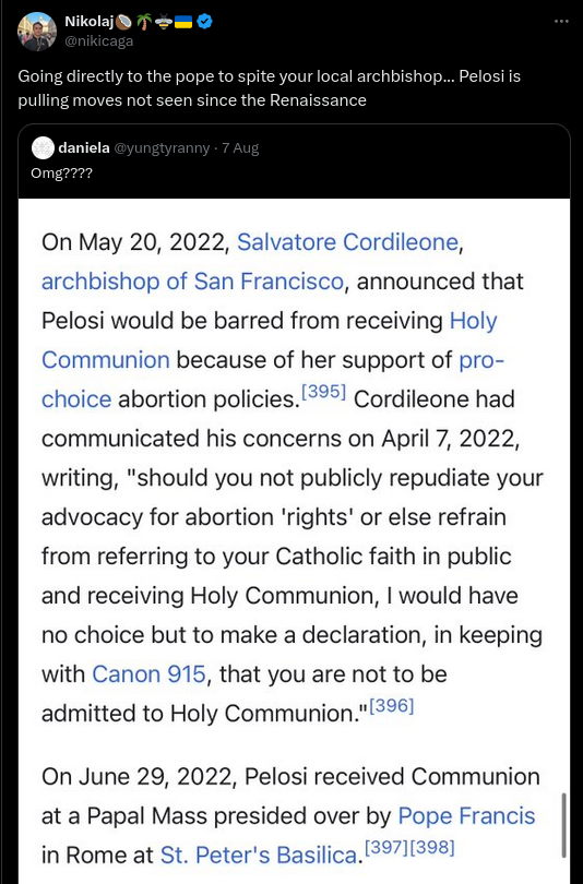 Former U.S. Speaker of the House Nancy Pelosi allegedly took communion at a papal Mass presided over by the pope at the Vatican despite Archbishop...