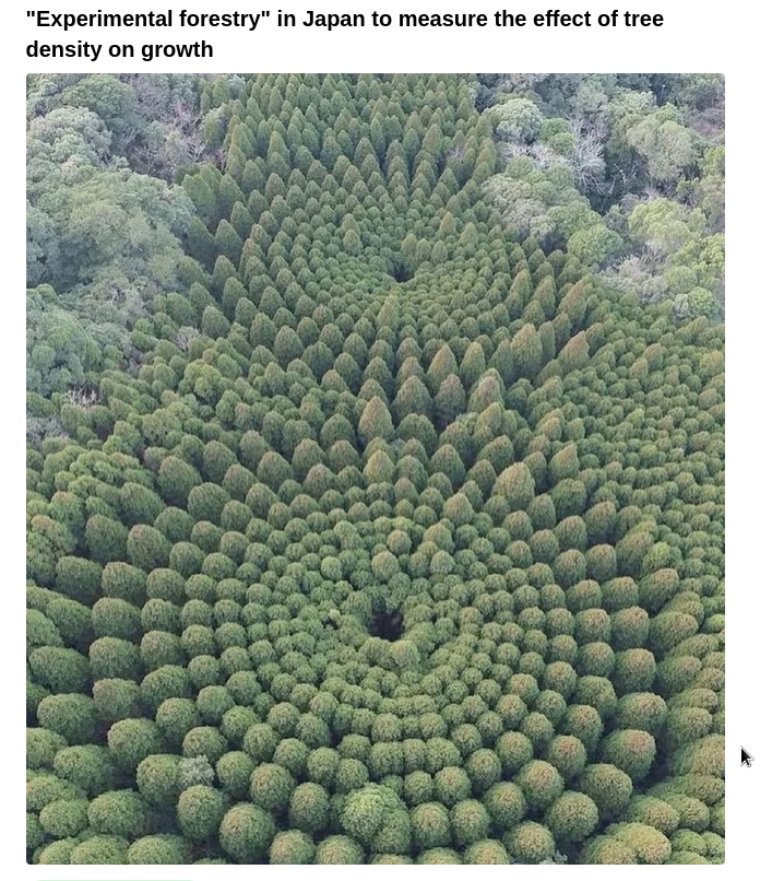 In late September 2024, a photograph allegedly showing an experimental forestry project in Japan spread online. One Reddit post with the photo read...