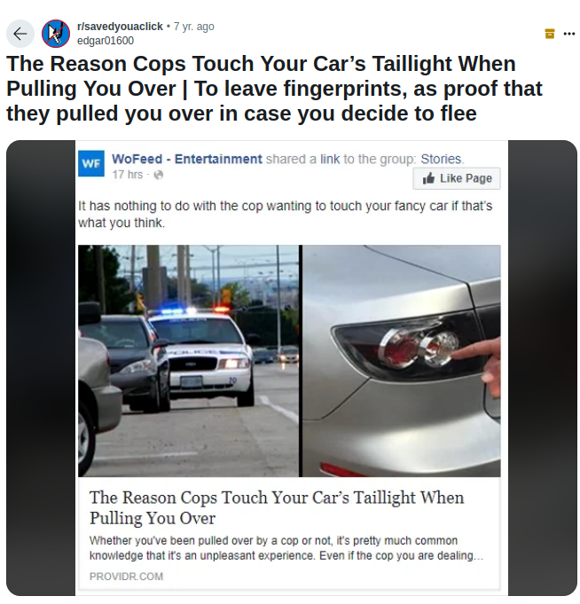 According to internet lore, police officers are taught to touch the taillights of cars they have pulled over so their fingerprints are on the ...