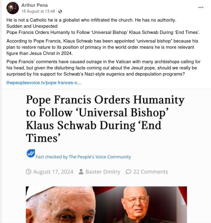 The Pope has not appointed Klaus Schwab ‘universal bishop’