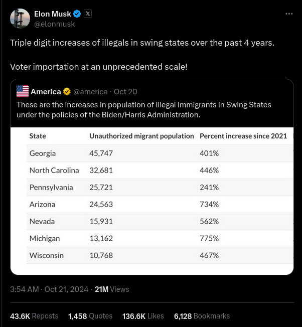 Post Does NOT Prove That Total Undocumented Populations In 7 States Increased Between 241% and 734% In 2021-24