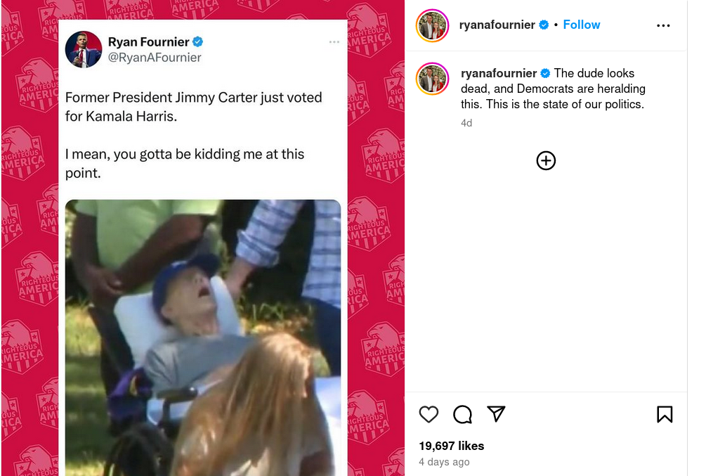 An Oct. 4 Instagram post includes a photo of former President Jimmy Carter at his 100th birthday celebration in Georgia...