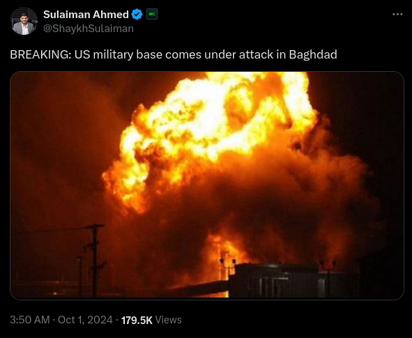 A facility housing US personnel in the Iraqi capital of Baghdad came under fire September 30, 2024 as the conflict between Israel and the...