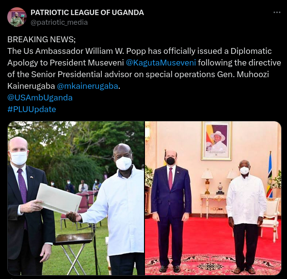 Posts falsely claim US ambassador apologised to Ugandan president