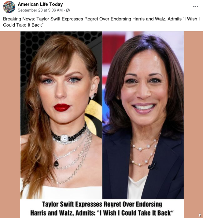Posts saying Swift ‘regrets’ endorsing Harris stem from satire