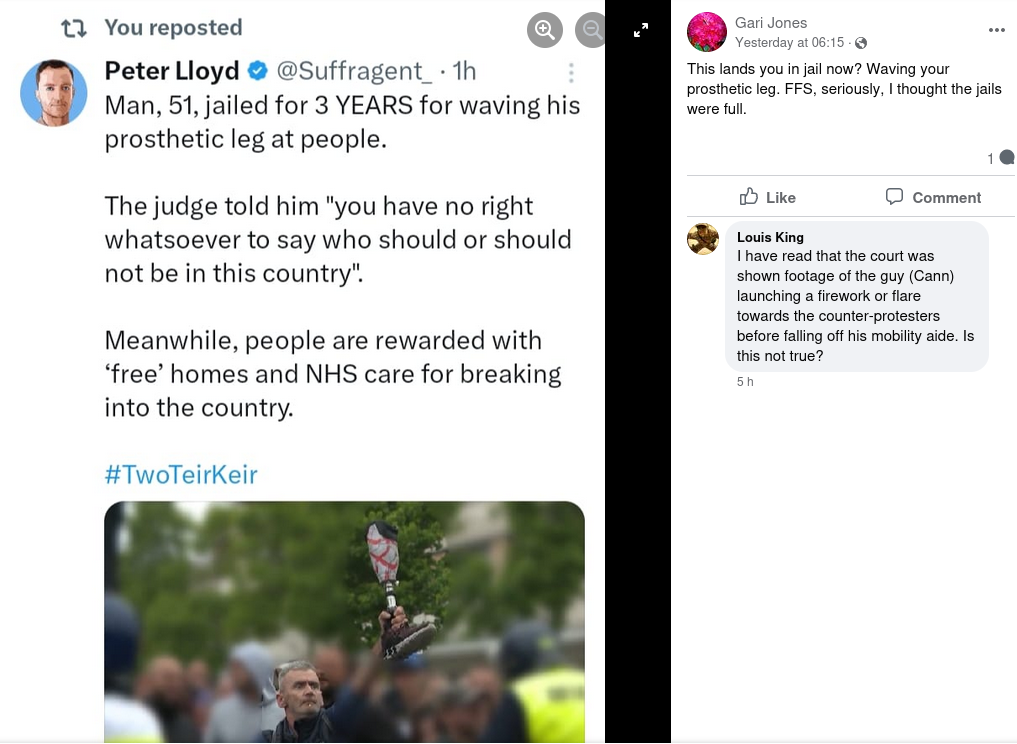 Protester jailed for violent disorder, not for waving a prosthetic leg
