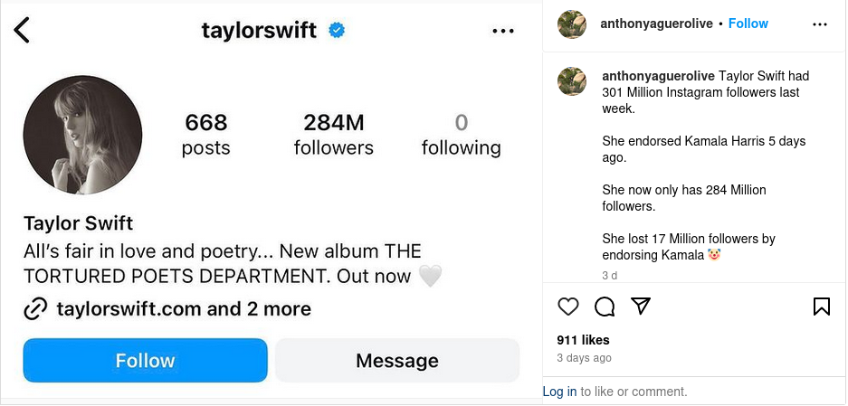 Ready for it? Taylor Swift didn’t lose millions of followers after endorsing Kamala Harris