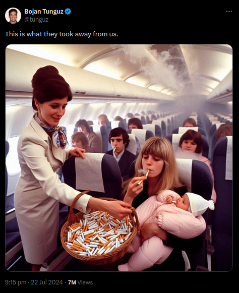 On July 22, 2024, an X user posted a photograph on X (archived) purportedly showing a flight attendant handing out cigarettes on an airplane. ...