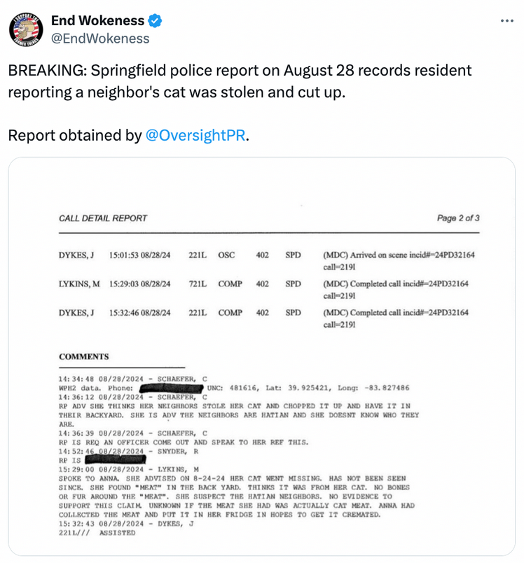 Does a police report prove that Haitian immigrants killed and mutilated a cat in Springfield, Ohio, as a post on X claimed? No, that's not true:...