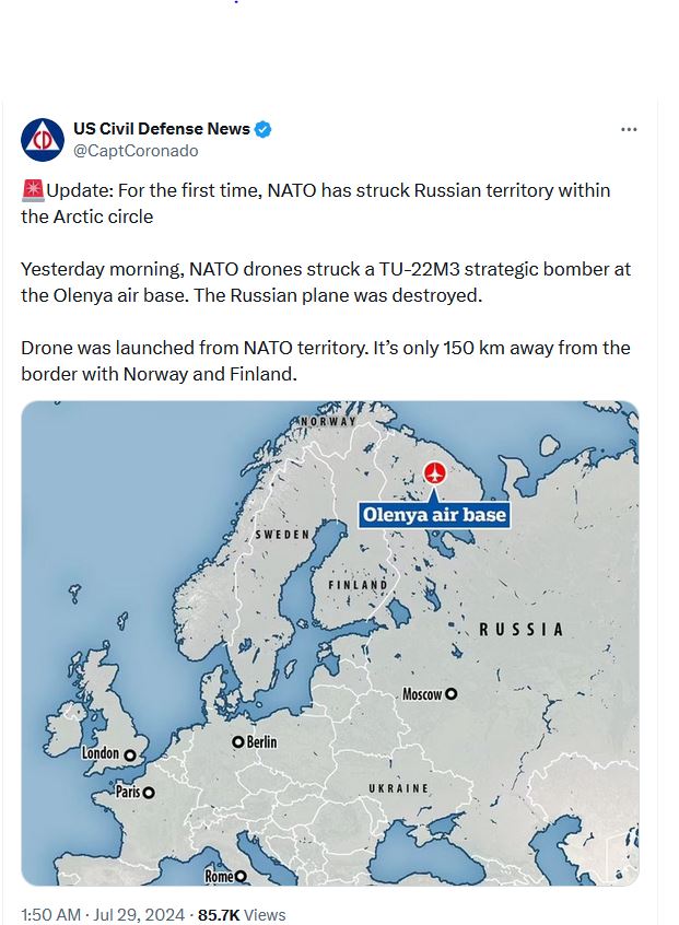 Russian Olenya base was hit by a Ukrainian drone, not by NATO
