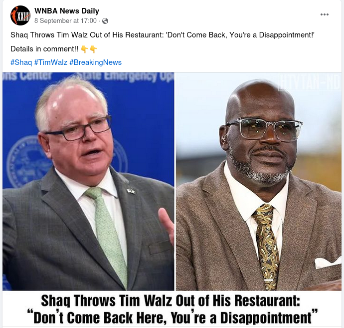 Satire site behind claim Shaquille O'Neal banished Tim Walz from his Atlanta restaurant