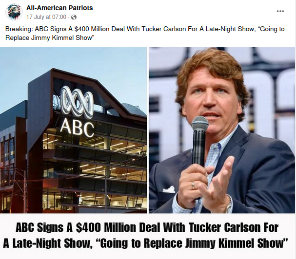 Satire story says ABC plans to replace Jimmy Kimmel with Tucker Carlson