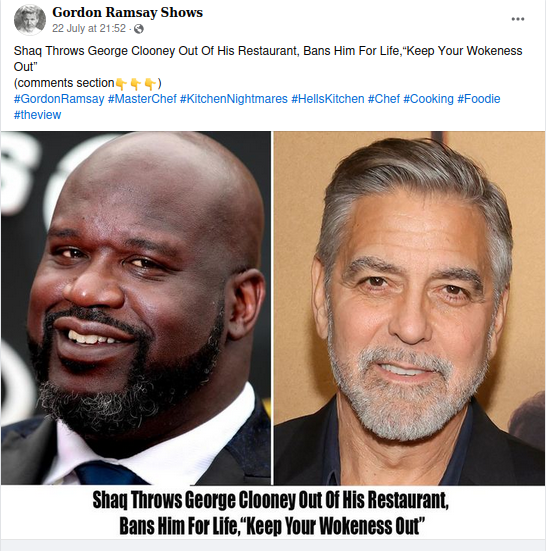 In July 2024, the Facebook page "Gordon Ramsay Shows" posted a rumor that former basketball star Shaquille O'Neal threw actor George Clooney out of...