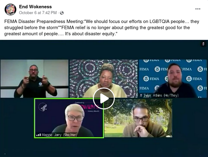 An Oct. 6 Facebook post includes a clip of a virtual Federal Emergency Management Agency discussion. "LGBTQIA people...already are struggling,"...