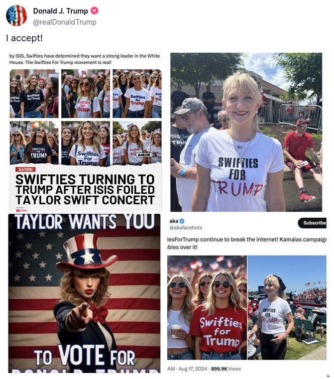 In August 2024, former U.S. President Donald Trump's Truth Social account posted a series of images purportedly showing Taylor Swift and her fans...