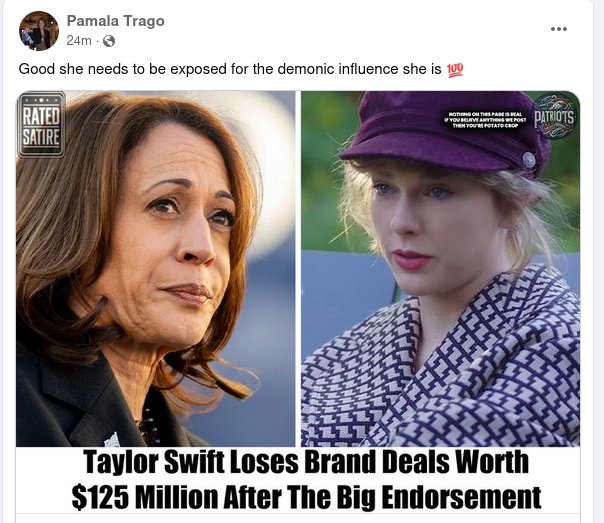 A rumor that pop superstar Taylor Swift lost $125 million in "brand deals" following her "big endorsement" circulated online in mid-September 2024...