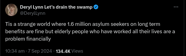 The posts say: “It's a strange world where 1.6 million asylum seekers on long term benefits are fine but elderly people who have worked all their...