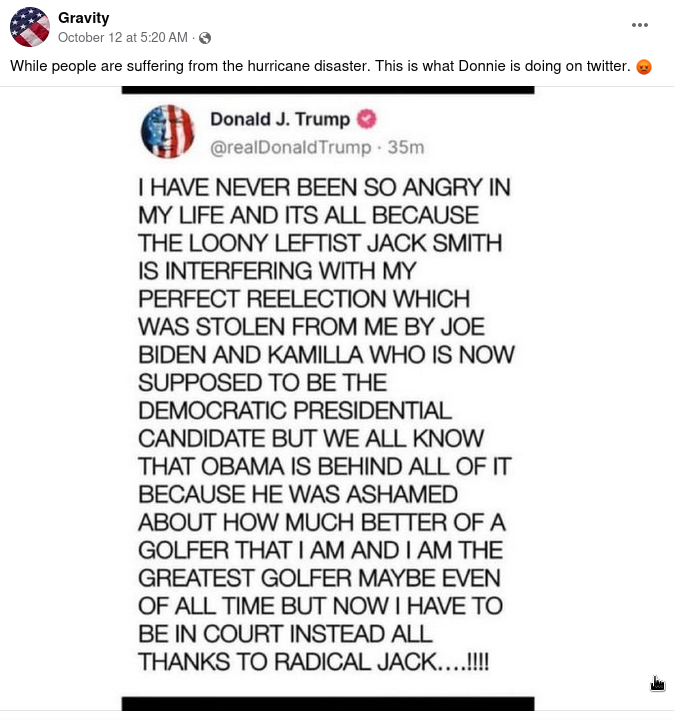An Oct. 12 Facebook post shows a screenshot of what appears to be a Truth Social post from former President Donald Trump...
