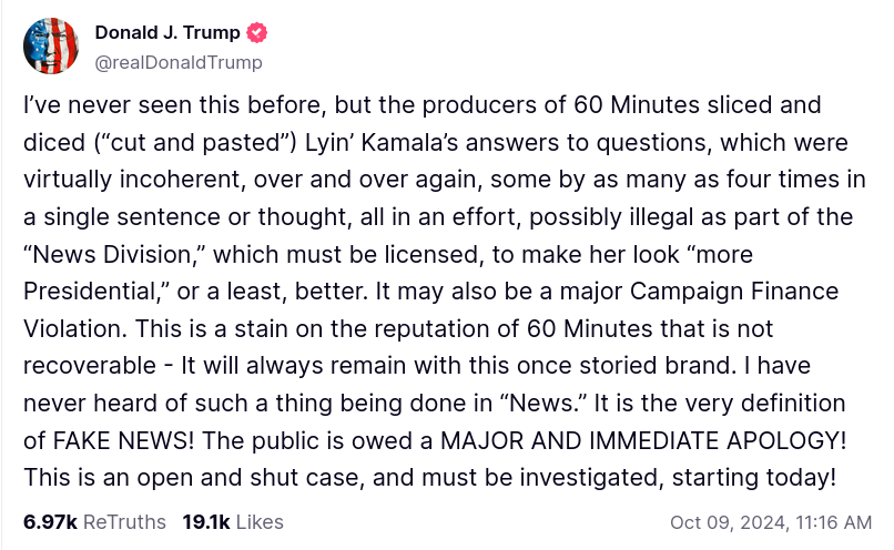 Trump claimed Harris’ ‘60 Minutes’ interview violated campaign finance law. That’s false
