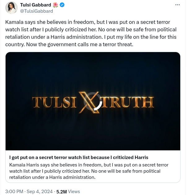 In a video announcement, former U.S. Rep. Tulsi Gabbard claimed in September 2024 that the U.S. government had placed her on a "secret terror...