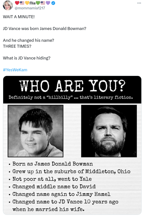 In late September 2024, social media users revived a rumor (archived) that Republican vice-presidential candidate JD Vance had changed his name...