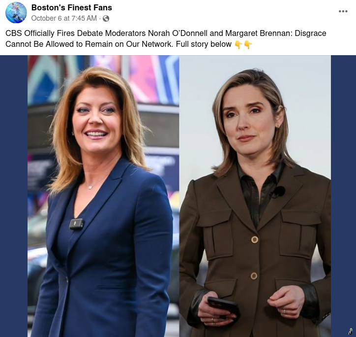 An Oct. 6 Facebook post includes side-by-side images of CBS journalists Norah O’Donnell and Margaret Brennan. “CBS Officially Fires Debate...