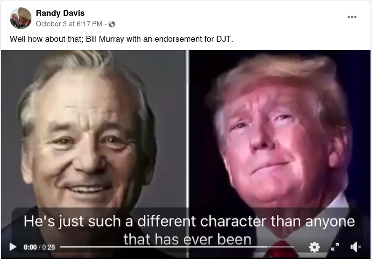 An Oct. 3 Facebook post shows an image of former President Donald Trump followed by a clip of an interview with actor Bill Murray...