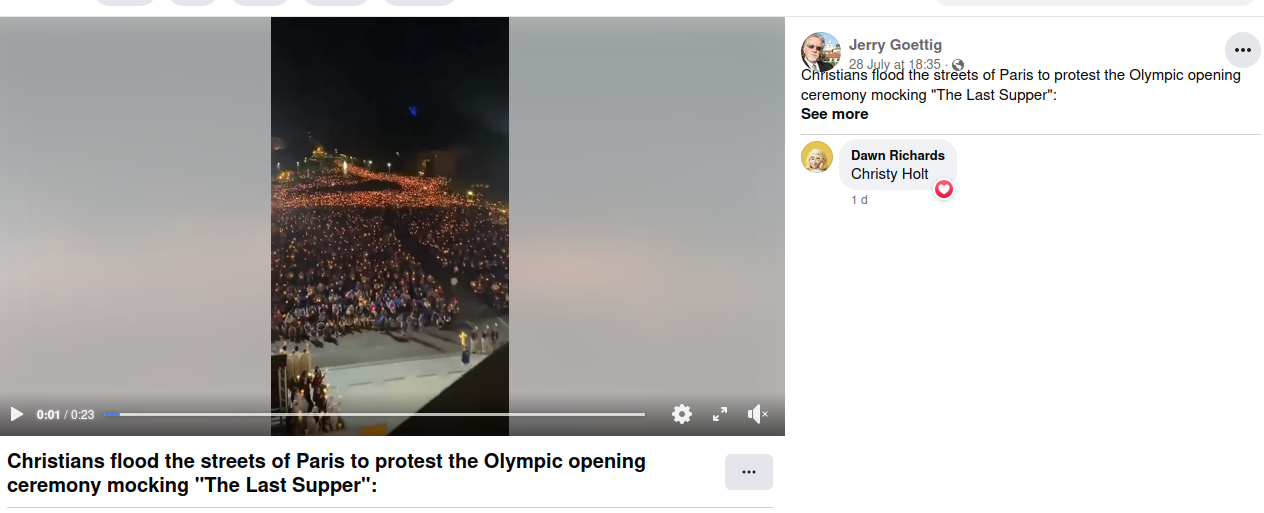 A video posted to multiple Facebook accounts which claims to show thousands of Christians protesting after the opening ceremony of the Paris Olympic..