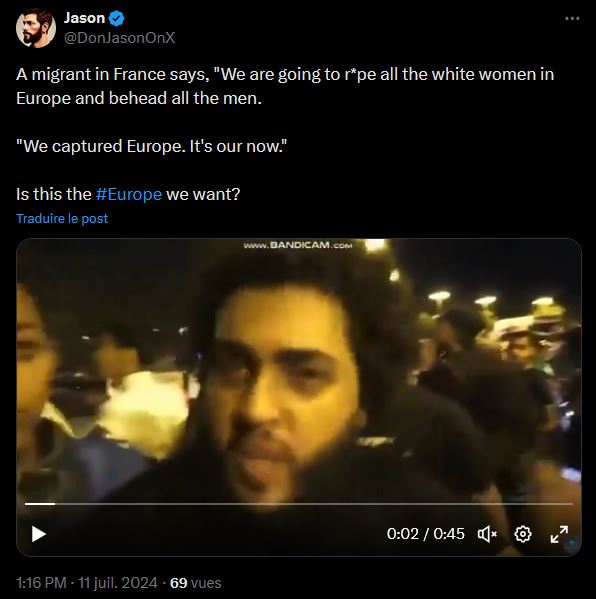 A video has been falsely claimed online to show an immigrant in France threatening to rape white women in Europe and behead the men. ...