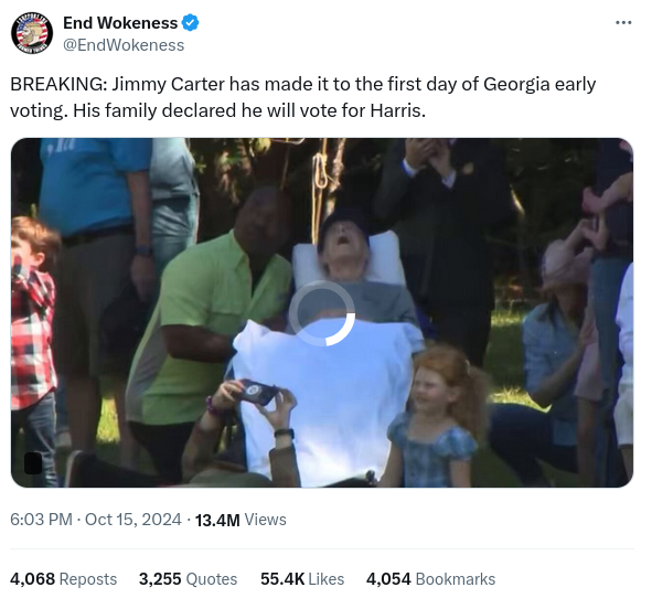 Does a video circulating on social media show Jimmy Carter, in a reclining wheelchair, waiting to cast a vote for Kamala Harris on October 15, 2024...