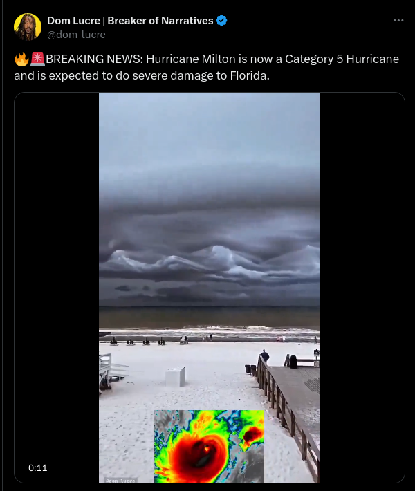 With Hurricane Milton roaring toward Florida as a potentially catastrophic Category 5 storm, social media users are claiming a video shows menacing...