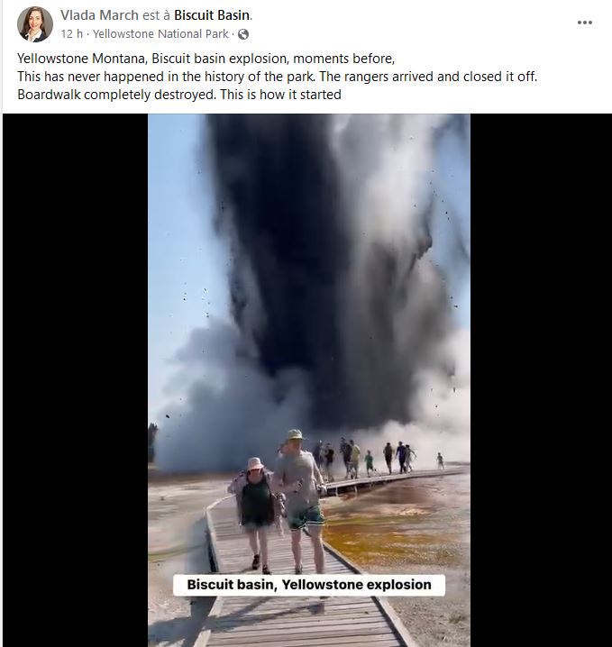 A video shared to Facebook on July 23, 2024, claimed to show the moments before and during an "explosion" at the Biscuit Basin region of Yellowstone..
