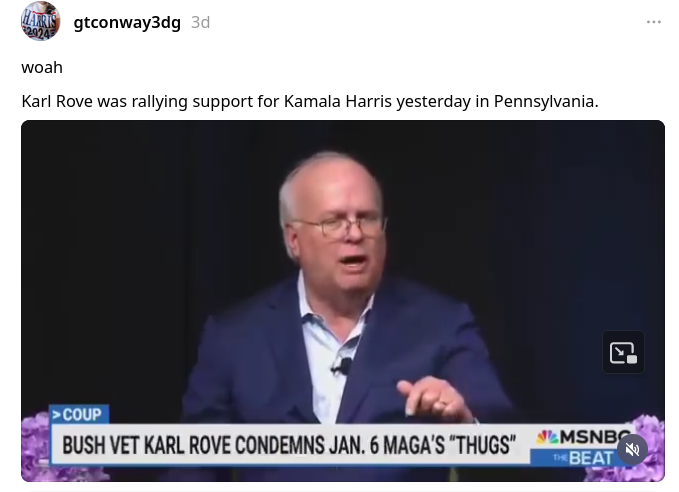 An Oct. 15 Threads post includes a clip of GOP strategist and former George W. Bush staffer Karl Rove speaking about former President Donald Trump...