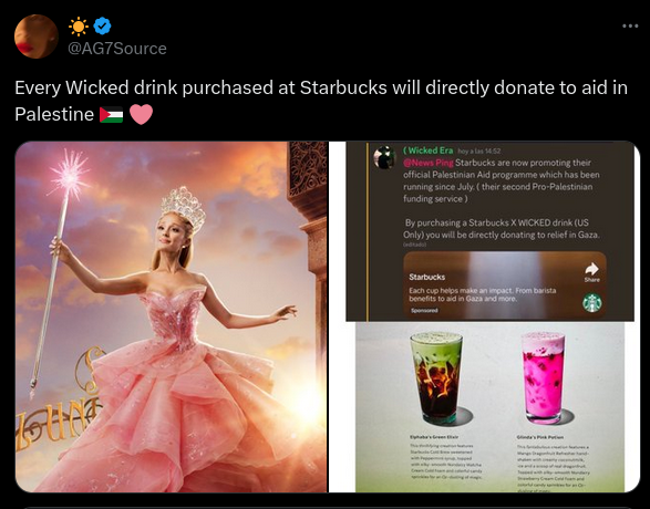Social media users are claiming that proceeds from Wicked x Starbucks drinks will go to aid in Palestine. The caption reads, “Every Wicked drink...