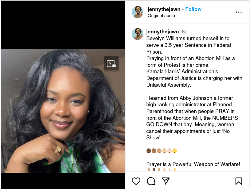 Woman imprisoned for blocking access to abortion clinic, not praying