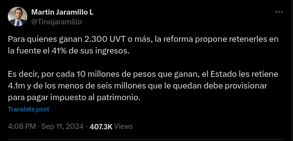 Reforma tributaria no propone retener 41% ‘por cada 10 millones de pesos’ que ganan los más ricos